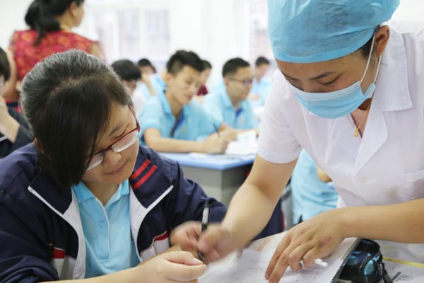 口腔內(nèi)科醫(yī)生胡倩倩在為學(xué)生詳細(xì)檢查口腔健康狀況