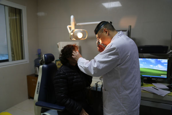 門診部主任蘇應(yīng)東為老人做眼科檢查